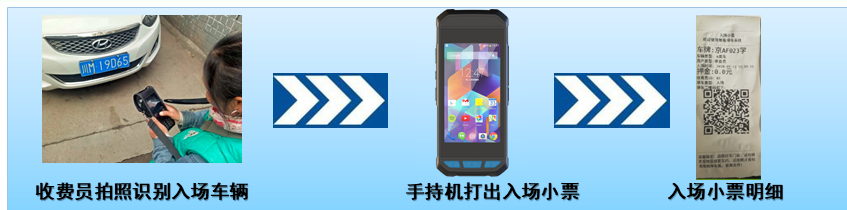 車輛入場——地磁檢測啟動——提交數(shù)據(jù)至后臺——手持端車位報警——手持機(jī)掃描車牌(錄入)——打印小票
